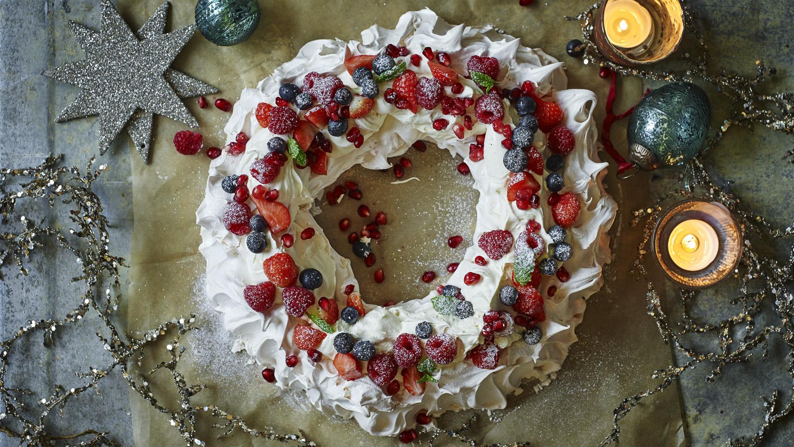 Finish your festive feast with a light yet show-stopping dessert that’s perfect after a rich main course. A crisp meringue base topped with softly whipped cream and a generous scattering of strawberries, blueberries, and raspberries creates a beautiful balance of sweetness and freshness. Garnish with fresh mint for a final festive flourish.